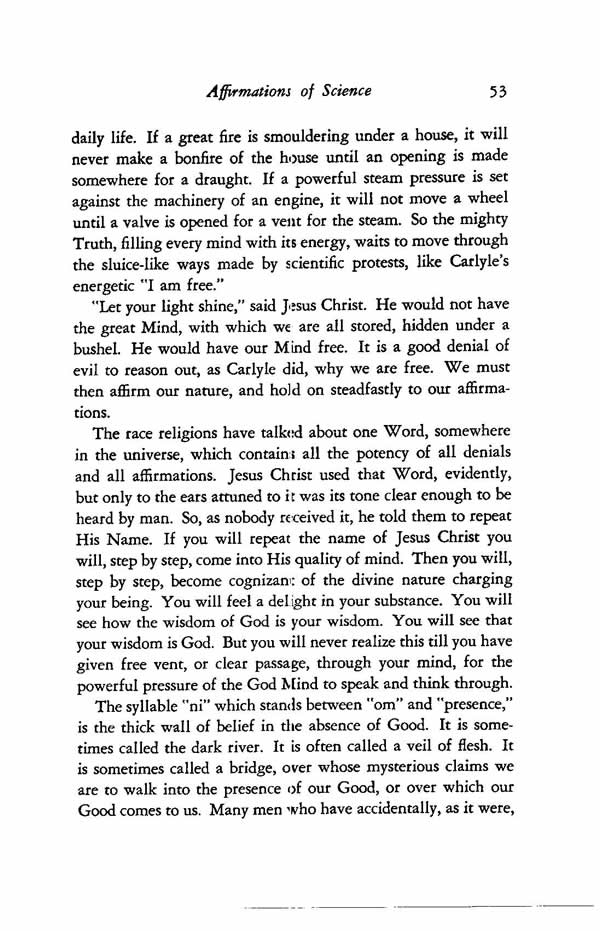 The syllable "ni" which stands between "om" and "presence," is the thick wall of belief in the absence of Good. It is sometimes called the dark river. It is often called a veil of flesh. It is sometimes called a bridge, over whose mysterious claims we are to walk into the presence of our Good, or over which our Good comes to us. Many men who have accidentally, as it were,