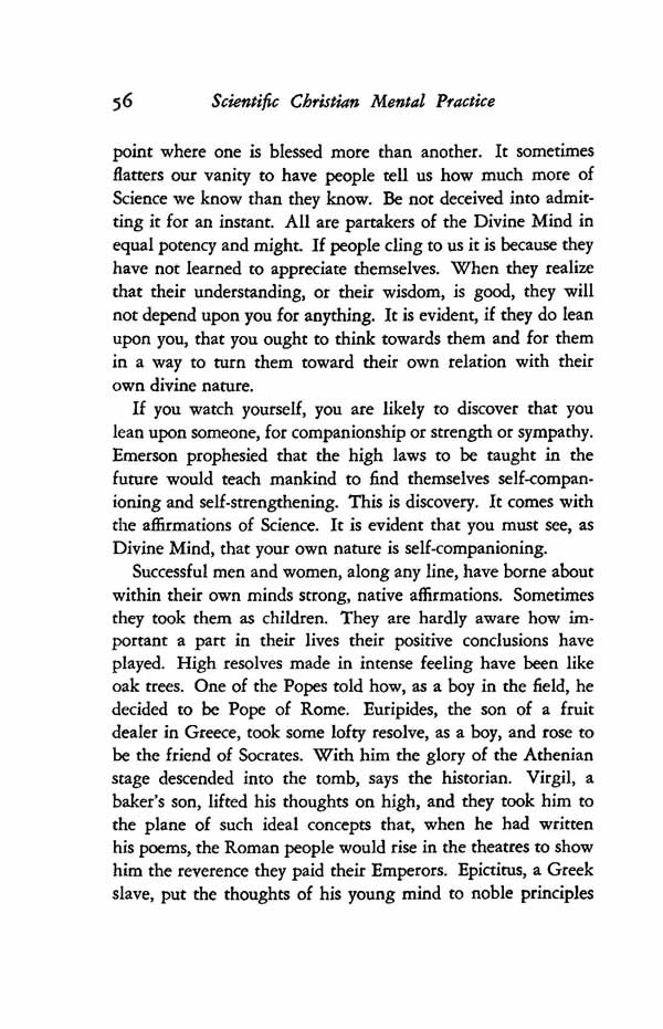 If you watch yourself, you are likely to discover that you lean upon someone, for companionship or strength or sympathy. Emerson prophesied that the high laws to be taught in the future would teach mankind to find themselves self-companioning and self-strengthening. This is discovery. It comes with the affirmations of Science. It is evident that you must see, as Divine Mind, that your own nature is self-companioning.