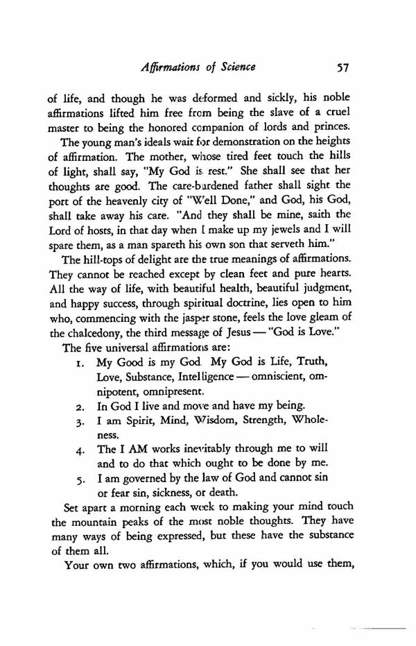 The hill-tops of delight are the true meanings of affirmations. They cannot be reached except by clean feet and pure hearts. All the way of life, with beautiful health, beautiful judgment, and happy success, through spiritual doctrine, lies open to him who, commencing with the jasper stone, feels the love gleam of the chalcedony, the third message of Jesus -- "God is Love."