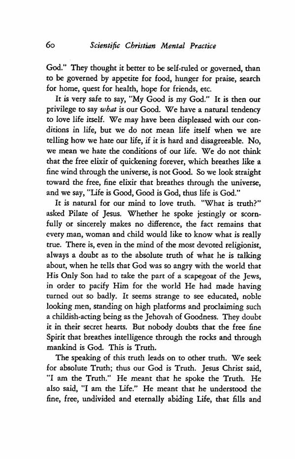 It is very safe to say, "My Good is my God." It is then our privilege to say what is our Good. We have a natural tendency to love life itself. We may have been displeased with our conditions in life, but we do not mean life itself when we are telling how we hate our life, if it is hard and disagreeable. No, we mean we hate the conditions of our life. We do not think that the free elixir of quickening forever, which breathes like a fine wind through the universe, is not Good. So we look straight toward the free, fine elixir that breathes through the universe, and we say, "Life is Good, Good is God, thus life is God."