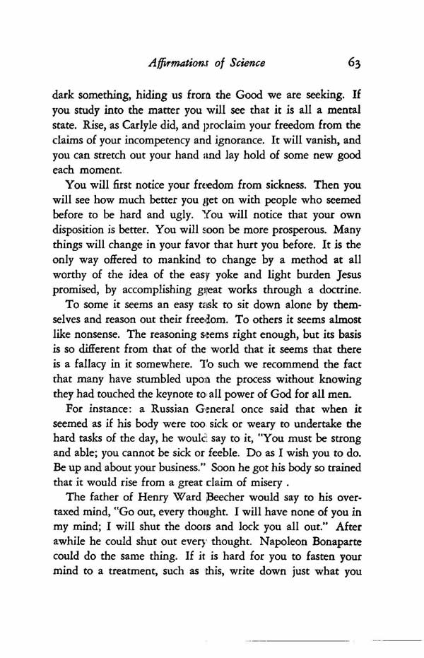 For instance: a Russian General once said that when it seemed as if his body were too sick or weary to undertake the hard tasks of the day, he would say to it, "You must be strong and able; you cannot be sick or feeble. Do as I wish you to do. Be up and about your business." Soon he got his body so trained that it would rise from a great claim of misery .