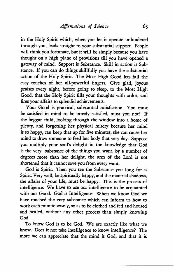 God is Spirit. Then you see the Substance you long for is Spirit. Very well, be spiritually happy, and the material shadows, the affairs of your life, must be happy. This is the process of intelligence. We have to use our intelligence to be acquainted with our Good. God is Intelligence. When we know God we have touched the very substance which can inform us how to work each minute wisely, so as to be clothed and fed and housed and healed, without any other process than simply knowing God.