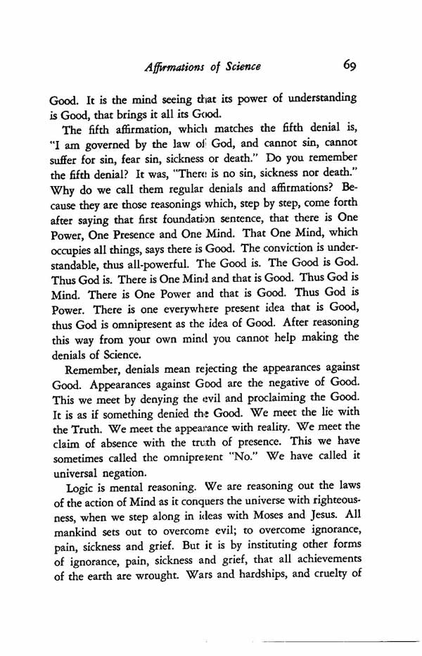 Why do we call them regular denials and affirmations? Because they are those reasonings which, step by step, come forth after saying that first foundation sentence, that there is One Power, One Presence and One Mind. That One Mind, which occupies all things, says there is Good. The conviction is understandable, thus all-powerful. The Good is. The Good is God. Thus God is. There is One Mind and that is Good. Thus God is Mind. There is One Power and that is Good. Thus God is Power. There is one everywhere present idea that is Good, thus God is omnipresent as the idea of Good. After reasoning this way from your own mind you cannot help making the denials of Science.