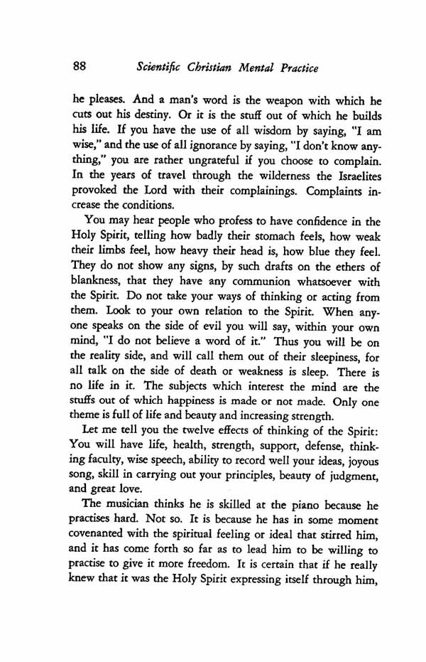 You may hear people who profess to have confidence in the Holy Spirit, telling how badly their stomach feels, how weak their limbs feel, how heavy their head is, how blue they feel. They do not show any signs, by such drafts on the ethers of blankness, that they have any communion whatsoever with the Spirit. Do not take your ways of thinking or acting from them. Look to your own relation to the Spirit. When anyone speaks on the side of evil you will say, within your own mind, "I do not believe a word of it." Thus you will be on the reality side, and will call them out of their sleepiness, for all talk on the side of death or weakness is sleep. There is no life in it. The subjects which interest the mind are the stuffs out of which happiness is made or not made. Only one theme is full of life and beauty and increasing strength.