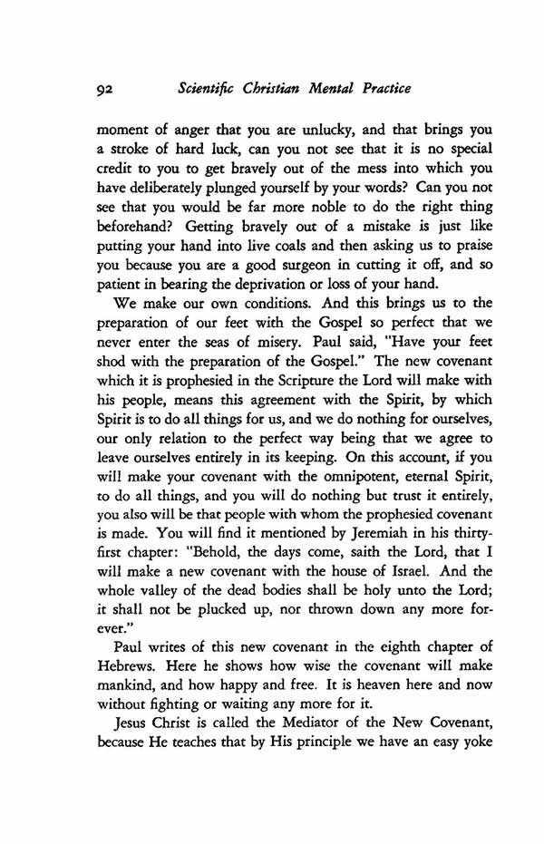 We make our own conditions. And this brings us to the preparation of our feet with the Gospel so perfect that we never enter the seas of misery. Paul said, "Have your feet shod with the preparation of the Gospel." The new covenant which it is prophesied in the Scripture the Lord will make with his people, means this agreement with the Spirit, by which Spirit is to do all things for us, and we do nothing for ourselves, our only relation to the perfect way being that we agree to leave ourselves entirely in its keeping. On this account, if you will make your covenant with the omnipotent, eternal Spirit, to do all things, and you will do nothing but trust it entirely, you also will be that people with whom the prophesied covenant is made. You will find it mentioned by Jeremiah in his thirty- first chapter: "Behold, the days come, saith the Lord, that I will make a new covenant with the house of Israel. And the whole valley of the dead bodies shall be holy unto the Lord; it shall not be plucked up, nor thrown down any more forever."