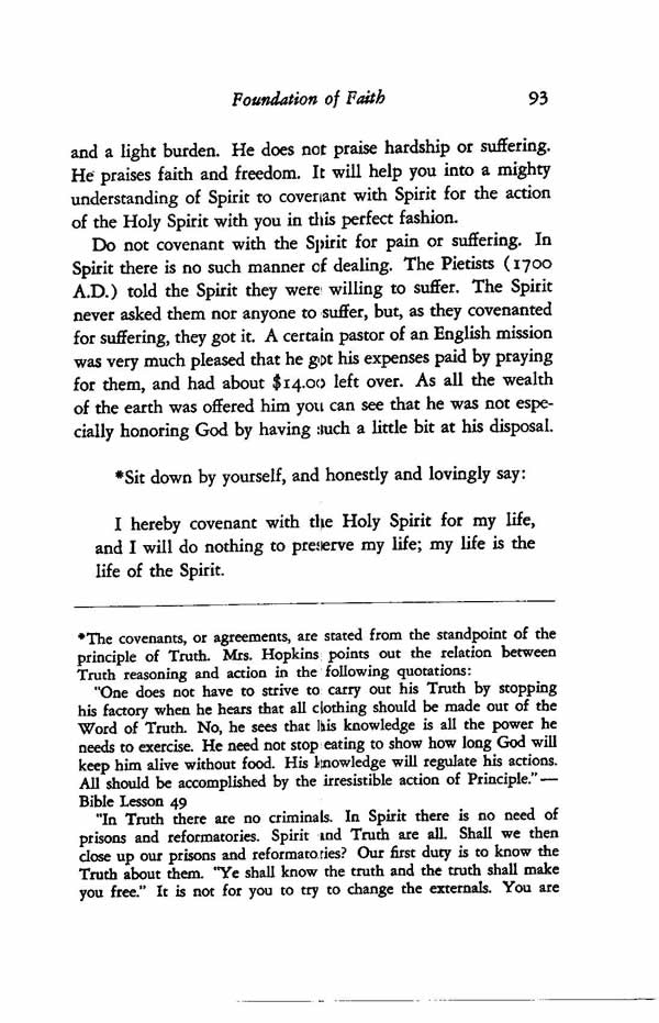Do not covenant with the Spirit for pain or suffering. In Spirit there is no such manner of dealing. The Pietists (1700 A.D.) told the Spirit they were willing to suffer. The Spirit never asked them nor anyone to suffer, but, as they covenanted for suffering, they got it. A certain pastor of an English mission was very much pleased that he got his expenses paid by praying for them, and had about $14.00 left over. As all the wealth of the earth was offered him you can see that he was not especially honoring God by having such a little bit at his disposal.