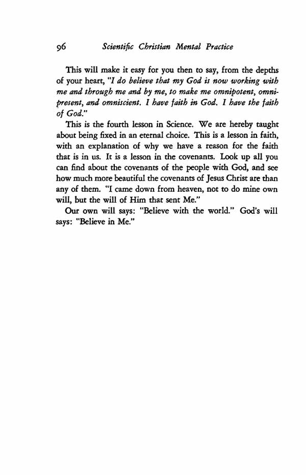 This is the fourth lesson in Science. We are hereby taught about being fixed in an eternal choice. This is a lesson in faith, with an explanation of why we have a reason for the faith that is in us. It is a lesson in the covenants. Look up all you can find about the covenants of the people with God, and see how much more beautiful the covenants of Jesus Christ are than any of them. "I came down from heaven, not to do mine own will, but the will of Him that sent Me."