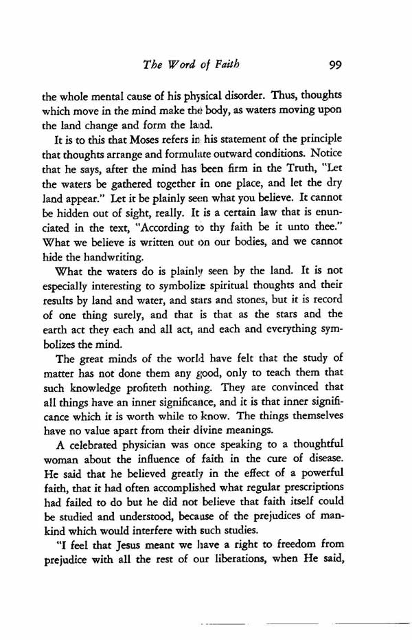 A celebrated physician was once speaking to a thoughtful woman about the influence of faith in the cure of disease. He said that he believed greatly in the effect of a powerful faith, that it had often accomplished what regular prescriptions had failed to do but he did not believe that faith itself could be studied and understood, because of the prejudices of mankind which would interfere with such studies.