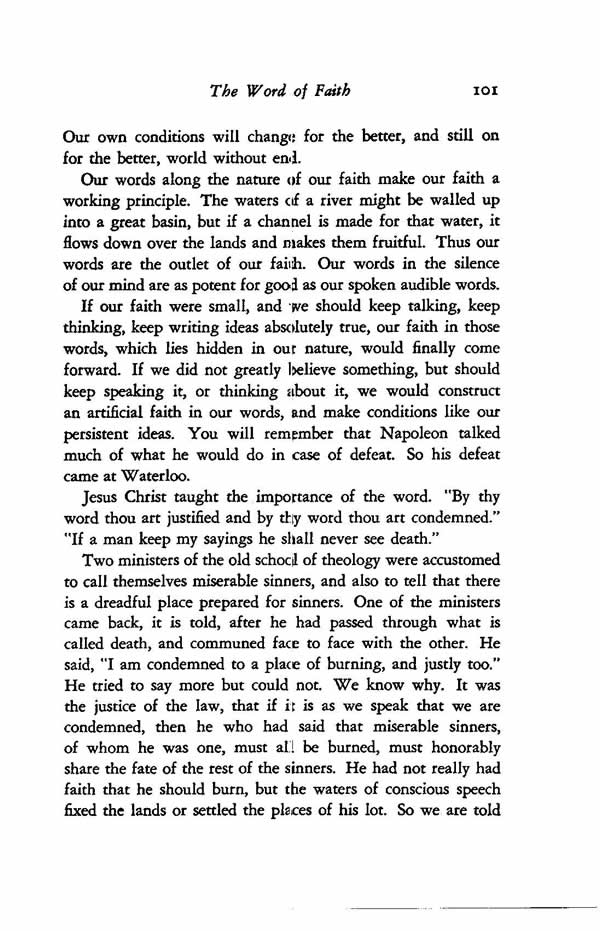 If our faith were small, and we should keep talking, keep thinking, keep writing ideas absolutely true, our faith in those words, which lies hidden in our nature, would finally come forward. If we did not greatly believe something, but should keep speaking it, or thinking about it, we would construct an artificial faith in our words, and make conditions like our persistent ideas. You will remember that Napoleon talked much of what he would do in case of defeat. So his defeat came at Waterloo.