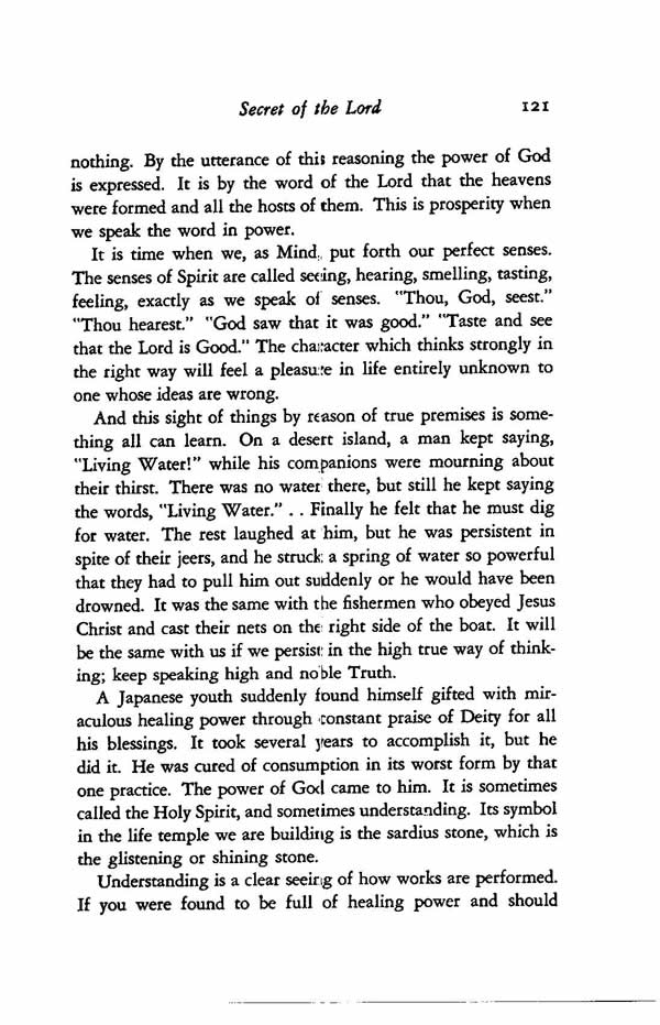 A Japanese youth suddenly found himself gifted with miraculous healing power through constant praise of Deity for all his blessings. It took several years to accomplish it, but he did it. He was cured of consumption in its worst form by that one practice. The power of God came to him. It is sometimes called the Holy Spirit, and sometimes understanding. Its symbol in the life temple we are building is the sardius stone, which is the glistening or shining stone.