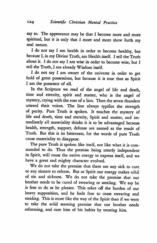 We do not take the premise that there are any sick to cure or any sinners to reform. But as Spirit our energy makes nihil of sin and sickness. We do not take the premise that our brother needs to be cured of swearing or stealing. We say he is free to do as he pleases. This takes off the burden of our heavy supposition, and he feels free to cease swearing and stealing. This is more like the way of the Spirit than if we were to take the solid seeming premise that our brother needs reforming, and cure him of his habits by treating him.