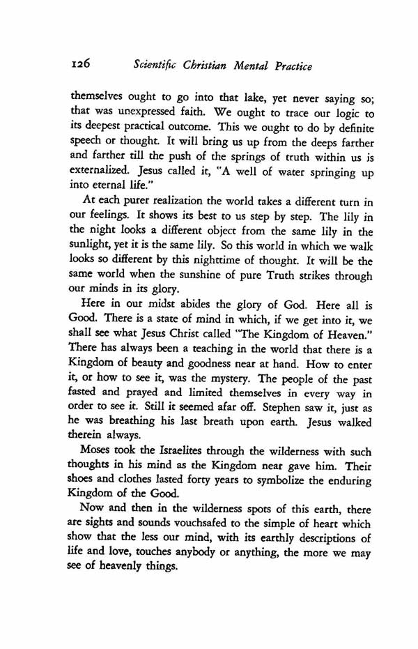 Here in our midst abides the glory of God. Here all is Good. There is a state of mind in which, if we get into it, we shall see what Jesus Christ called "The Kingdom of Heaven." There has always been a teaching in the world that there is a Kingdom of beauty and goodness near at hand. How to enter it, or how to see it, was the mystery. The people of the past fasted and prayed and limited themselves in every way in order to see it. Still it seemed afar off. Stephen saw it, just as he was breathing his last breath upon earth. Jesus walked therein always.
