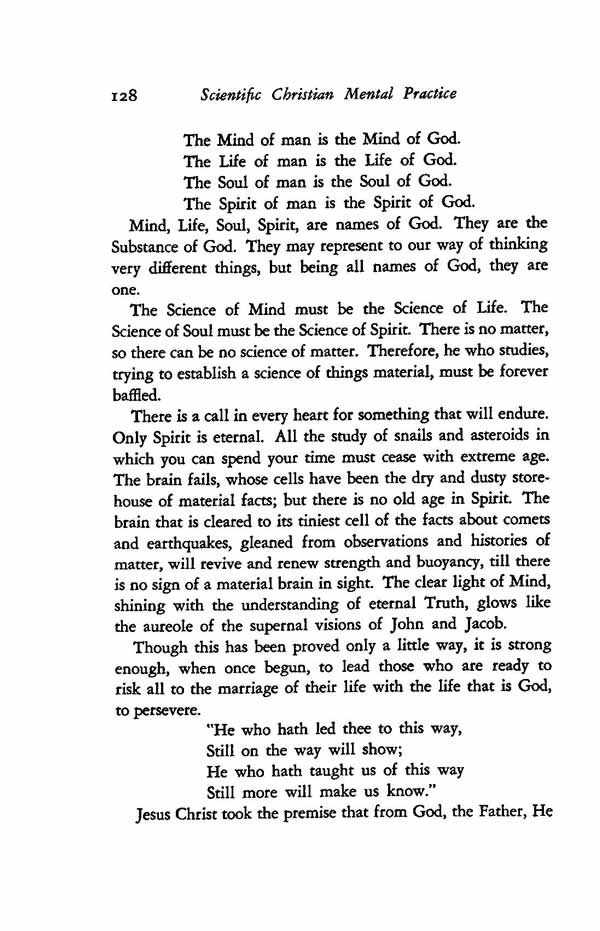 Mind, Life, Soul, Spirit, are names of God. They are the Substance of God. They may represent to our way of thinking very different things, but being all names of God, they are one.