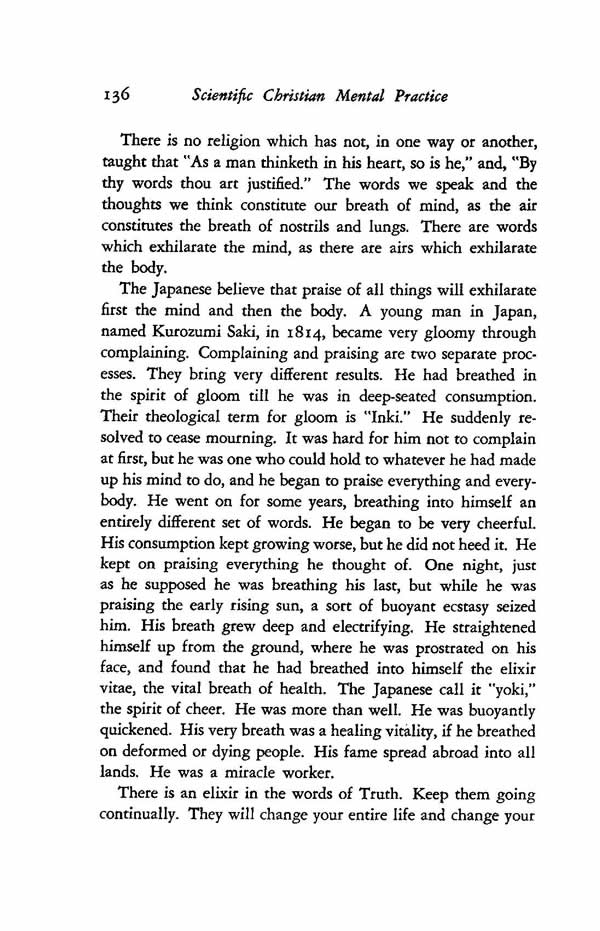 The Japanese believe that praise of all things will exhilarate first the mind and then the body. A young man in Japan, named Kurozumi Saki, in 1814, became very gloomy through complaining. Complaining and praising are two separate processes. They bring very different results. He had breathed in the spirit of gloom till he was in deep-seated consumption. Their theological term for gloom is "Inki." He suddenly resolved to cease mourning. It was hard for him not to complain at first, but he was one who could hold to whatever he had made up his mind to do, and he began to praise everything and everybody. He went on for some years, breathing into himself an entirely different set of words. He began to be very cheerful. His consumption kept growing worse, but he did not heed it. He kept on praising everything he thought of. One night, just as he supposed he was breathing his last, but while he was praising the early rising sun, a sort of buoyant ecstasy seized him. His breath grew deep and electrifying. He straightened himself up from the ground, where he was prostrated on his face, and found that he had breathed into himself the elixir vitae, the vital breath of health. The Japanese call it "yoki," the spirit of cheer. He was more than well. He was buoyantly quickened. His very breath was a healing vitality, if he breathed on deformed or dying people. His fame spread abroad into all lands. He was a miracle worker.