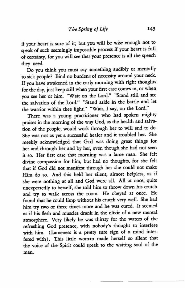 There was a young practitioner who had spoken mighty praises in the morning of the way God, as the health and salvation of the people, would work through her to will and to do. She was not as yet a successful healer and it troubled her. She meekly acknowledged that God was doing great things for her and through her and by her, even though she had not seen it so. Her first case that morning was a lame man. She felt divine compassion for him, but had no thoughts, for she felt that if God did not manifest through her she could not make Him do so. And this held her silent, almost helpless, as if she were nothing at all and God were all. All at once, quite unexpectedly to herself, she told him to throw down his crutch and try to walk across the room. He obeyed at once. He found that he could limp without his crutch very well. She had him try two or three times more and he was cured. It seemed as if his flesh and muscles drank in the elixir of a new mental atmosphere. Very likely he was thirsty for the waters of the refreshing God presence, with nobody's thought to interfere with him. (Lameness is a pretty sure sign of a mind interfered with). This little woman made herself so silent that the voice of the Spirit could speak to the waiting soul of the man.