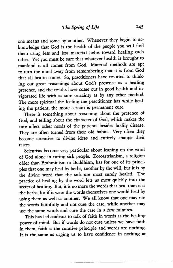 Scientists become very particular about leaning on the word of God alone in curing sick people. Zoroastrianism, a religion older than Brahminism or Buddhism, has for one of its principles that one may heal by herbs, another by the will, but it is by the divine word that the sick are most surely healed. The practice of healing by the word lets us most quickly into the secret of healing. But, it is no more the words that heal than it is the herbs, for if it were the words themselves one would heal by using them as well as another. We all know that one may use the words faithfully and not cure the case, while another may use the same words and cure the case in a few minutes.