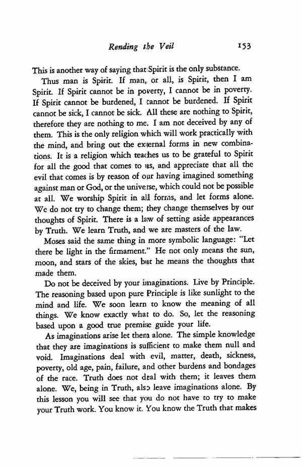 Thus man is Spirit. If man, or all, is Spirit, then I am Spirit. If Spirit cannot be in poverty, I cannot be in poverty. If Spirit cannot be burdened, I cannot be burdened. If Spirit cannot be sick, I cannot be sick. All these are nothing to Spirit, therefore they are nothing to me. I am not deceived by any of them. This is the only religion which will work practically with the mind, and bring out the external forms in new combinations. It is a religion which teaches us to be grateful to Spirit for all the good that comes to us, and appreciate that all the evil that comes is by reason of our having imagined something against man or God, or the universe, which could not be possible at all. We worship Spirit in all forms, and let forms alone. We do not try to change them; they change themselves by our thoughts of Spirit. There is a law of setting aside appearances by Truth. We learn Truth, and we are masters of the law.