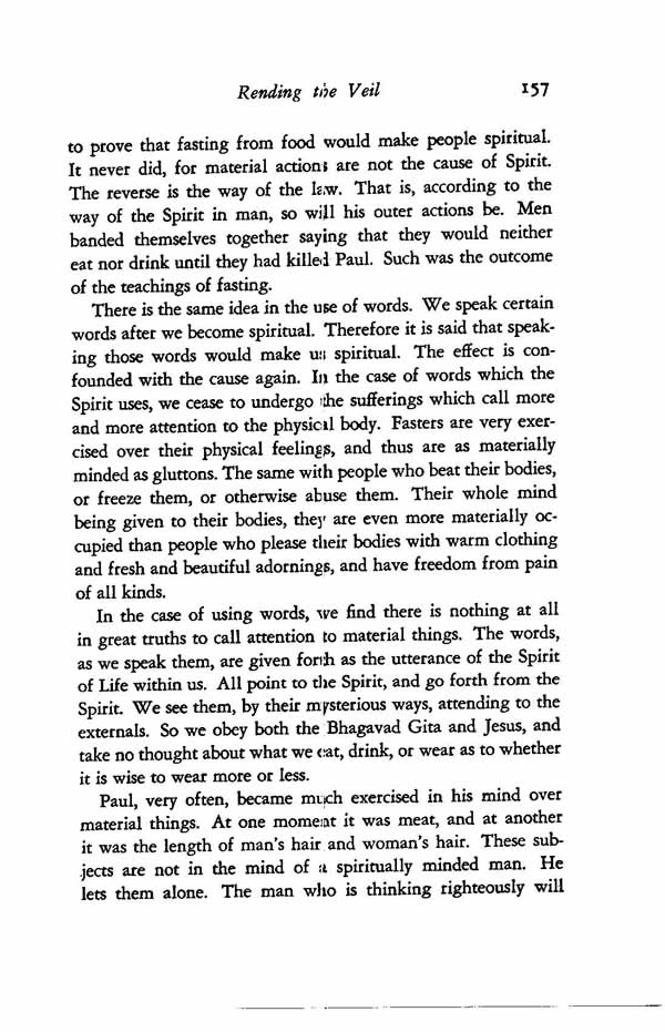 In the case of using words, we find there is nothing at all in great truths to call attention to material things. The words, as we speak them, are given forth as the utterance of the Spirit of Life within us. All point to the Spirit, and go forth from the Spirit. We see them, by their mysterious ways, attending to the externals. So we obey both the Bhagavad Gita and Jesus, and take no thought about what we eat, drink, or wear as to whether it is wise to wear more or less.
