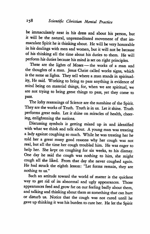 Discussing symbols is getting mixed up in and identified with what we think and talk about. A young man was treating a lady against coughing so much. While he was treating her he told her a great many good reasons why her cough was not real, but all the time her cough troubled him. He was eager to help her. She kept on coughing for six weeks, to his dismay. One day he said the cough was nothing to him, she might cough all she liked. From that day she never coughed again. He had struck the eighth lesson: "Let forms remain, they are nothing to us."