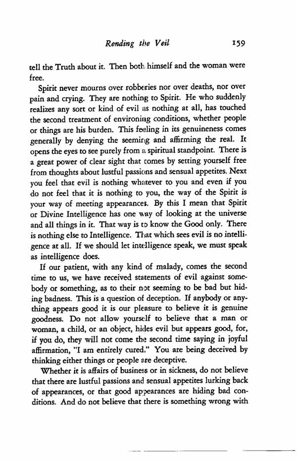 Spirit never mourns over robberies nor over deaths, nor over pain and crying. They are nothing to Spirit. He who suddenly realizes any sort or kind of evil as nothing at all, has touched the second treatment of environing conditions, whether people or things are his burden. This feeling in its genuineness comes generally by denying the seeming and affirming the real. It opens the eyes to see purely from a spiritual standpoint. There is a great power of clear sight that comes by setting yourself free from thoughts about lustful passions and sensual appetites. Next you feel that evil is nothing whatever to you and even if you do not feel that it is nothing to you, the way of the Spirit is your way of meeting appearances. By this I mean that Spirit or Divine Intelligence has one way of looking at the universe and all things in it. That way is to know the Good only. There is nothing else to Intelligence. That which sees evil is no intelligence at all. If we should let intelligence speak, we must speak as intelligence does.