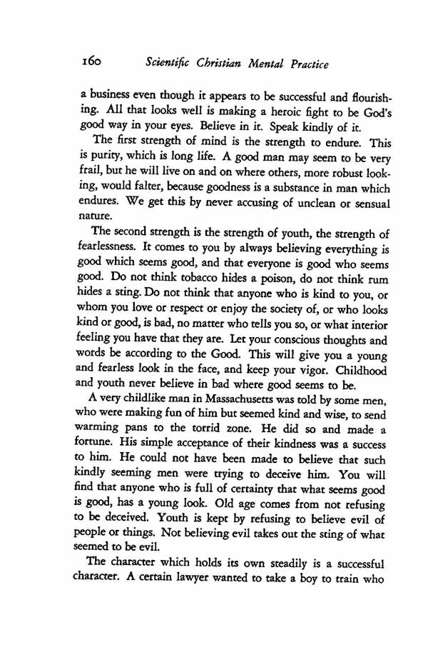 A very childlike man in Massachusetts was told by some men, who were making fun of him but seemed kind and wise, to send warming pans to the torrid zone. He did so and made a fortune. His simple acceptance of their kindness was a success to him. He could not have been made to believe that such kindly seeming men were trying to deceive him. You will find that anyone who is full of certainty that what seems good is good, has a young look. Old age comes from not refusing to be deceived. Youth is kept by refusing to believe evil of people or things. Not believing evil takes out the sting of what seemed to be evil.