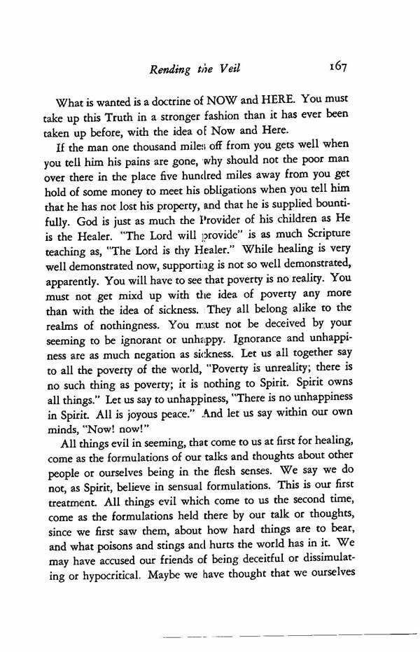 If the man one thousand miles off from you gets well when you tell him his pains are gone, why should not the poor man over there in the place five hundred miles away from you get hold of some money to meet his obligations when you tell him that he has not lost his property, and that he is supplied bountifully. God is just as much the Provider of his children as He is the Healer. "The Lord will provide" is as much Scripture teaching as, "The Lord is thy Healer." While healing is very well demonstrated now, supporting is not so well demonstrated, apparently. You will have to see that poverty is no reality. You must not get mixed up with the idea of poverty any more than with the idea of sickness. They all belong alike to the realms of nothingness. You must not be deceived by your seeming to be ignorant or unhappy. Ignorance and unhappiness are as much negation as sickness. Let us all together say to all the poverty of the world, "Poverty is unreality; there is no such thing as poverty; it is nothing to Spirit. Spirit owns all things." Let us say to unhappiness, "There is no unhappiness in Spirit. All is joyous peace." And let us say within our own minds, "Now! now!"