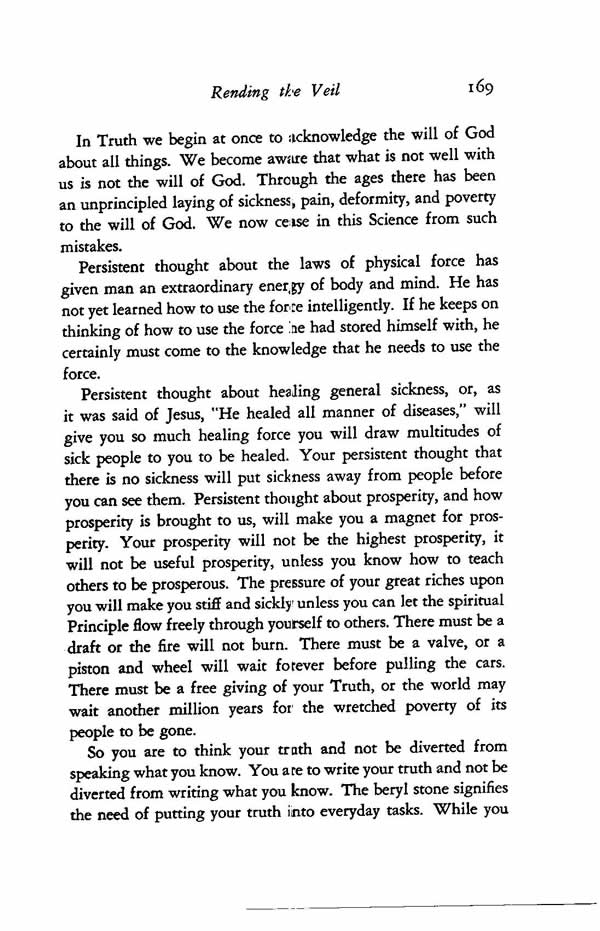 Persistent thought about healing general sickness, or, as it was said of Jesus, "He healed all manner of diseases," will give you so much healing force you will draw multitudes of sick people to you to be healed. Your persistent thought that there is no sickness will put sickness away from people before you can see them. Persistent thought about prosperity, and how prosperity is brought to us, will make you a magnet for prosperity. Your prosperity will not be the highest prosperity, it will not be useful prosperity, unless you know how to teach others to be prosperous. The pressure of your great riches upon you will make you stiff and sickly unless you can let the spiritual Principle flow freely through yourself to others. There must be a draft or the fire will not burn. There must be a valve, or a piston and wheel will wait forever before pulling the cars. There must be a free giving of your Truth, or the world may wait another million years for the wretched poverty of its people to be gone.