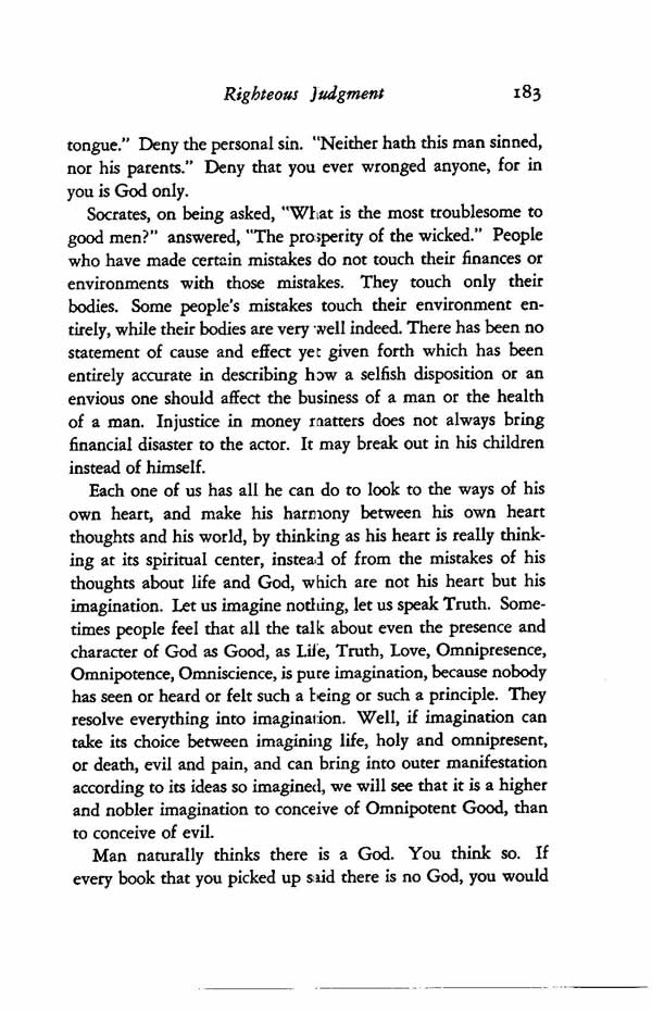 Each one of us has all he can do to look to the ways of his own heart, and make his harmony between his own heart thoughts and his world, by thinking as his heart is really thinking at its spiritual center, instead of from the mistakes of his thoughts about life and God, which are not his heart but his imagination. Let us imagine nothing, let us speak Truth. Sometimes people feel that all the talk about even the presence and character of God as Good, as Life, Truth, Love, Omnipresence, Omnipotence, Omniscience, is pure imagination, because nobody has seen or heard or felt such a being or such a principle. They resolve everything into imagination. Well, if imagination can take its choice between imagining life, holy and omnipresent, or death, evil and pain, and can bring into outer manifestation according to its ideas so imagined, we will see that it is a higher and nobler imagination to conceive of Omnipotent Good, than to conceive of evil.