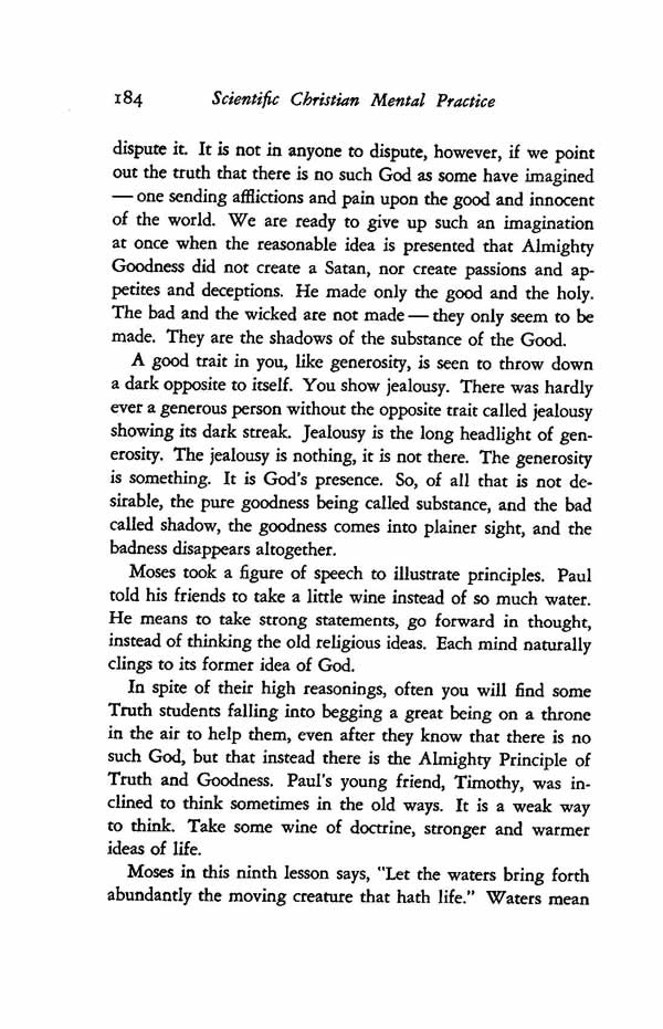 dispute it. It is not in anyone to dispute, however, if we point out the truth that there is no such God as some have imagined one sending afflictions and pain upon the good and innocent of the world. We are ready to give up such an imagination at once when the reasonable idea is presented that Almighty Goodness did not create a Satan, nor create passions and appetites and deceptions. He made only the good and the holy. The bad and the wicked are not made -- they only seem to be made. They are the shadows of the substance of the Good.