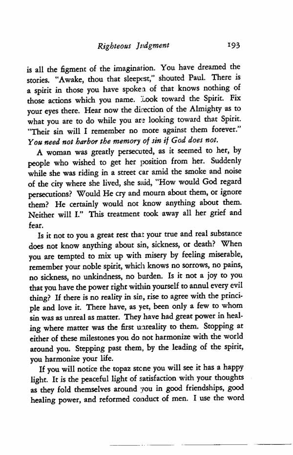 Is it not to you a great rest that your true and real substance does not know anything about sin, sickness, or death? When you are tempted to mix up with misery by feeling miserable, remember your noble spirit, which knows no sorrows, no pains, no sickness, no unkindness, no burden. Is it not a joy to you that you have the power right within yourself to annul every evil thing? If there is no reality in sin, rise to agree with the principle and love it. There have, as yet, been only a few to whom sin was as unreal as matter. They have had great power in healing where matter was the first unreality to them. Stopping at either of these milestones you do not harmonize with the world around you. Stepping past them, by the leading of the spirit, you harmonize your life.