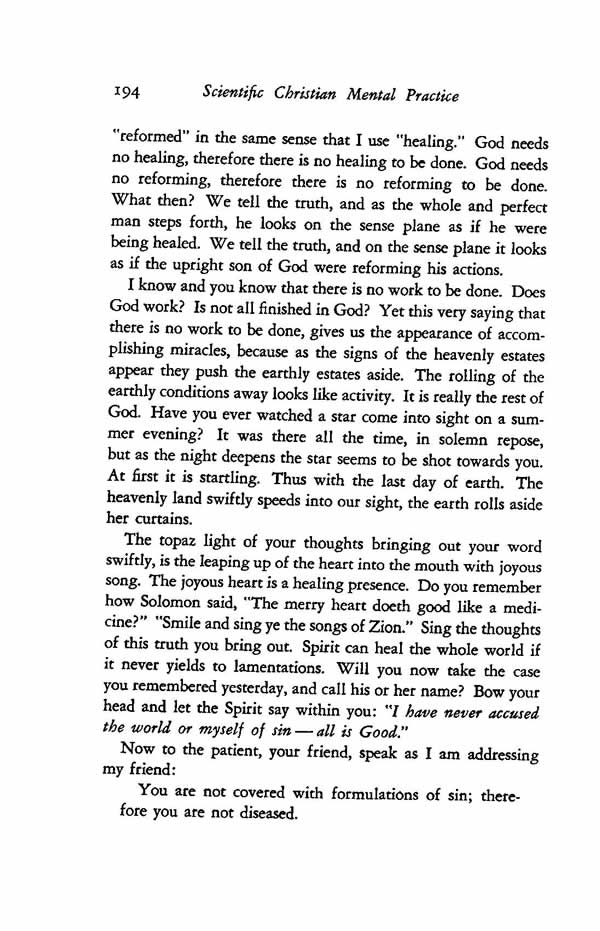 "reformed" in the same sense that I use "healing." God needs no healing, therefore there is no healing to be done. God needs no reforming, therefore there is no reforming to be done. What then? We tell the truth, and as the whole and perfect man steps forth, he looks on the sense plane as if he were being healed. We tell the truth, and on the sense plane it looks as if the upright son of God were reforming his actions.
