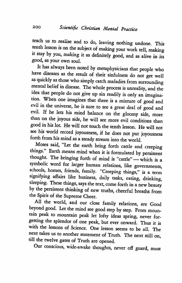 It has always been noted by metaphysicians that people who have diseases as the result of their sinfulness do not get well as quickly as those who simply catch maladies from surrounding mental belief in disease. The whole process is unreality, and the idea that people do not give up sin readily is only an imagination. When one imagines that there is a mixture of good and evil in the universe, he is sure to see a great deal of good and evil. If he lets his mind balance on the gloomy side, more than on the joyous side, he will see more evil conditions than good in his lot. He will not touch the tenth lesson. He will not see his world record joyousness, if he does not put joyousness forth from his mind as a steady stream into the world.