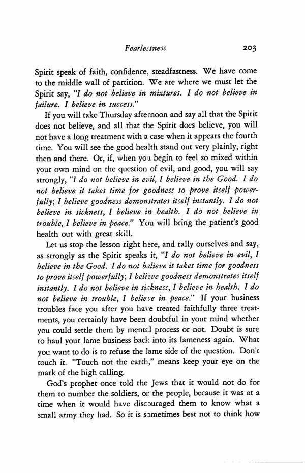 If you will take Thursday afternoon and say all that the Spirit does not believe, and all that the Spirit does believe, you will not have a long treatment with a case when it appears the fourth time. You will see the good health stand out very plainly, right then and there. Or, if, when you begin to feel so mixed within your own mind on the question of evil, and good, you will say strongly, "I do not believe in evil, I believe in the Good. I do not believe it takes time for goodness to prove itself powerfully; I believe goodness demonstrates itself instantly. I do not believe in sickness, I believe in health. I do not believe in trouble, I believe in peace." You will bring the patient's good health out with great skill.