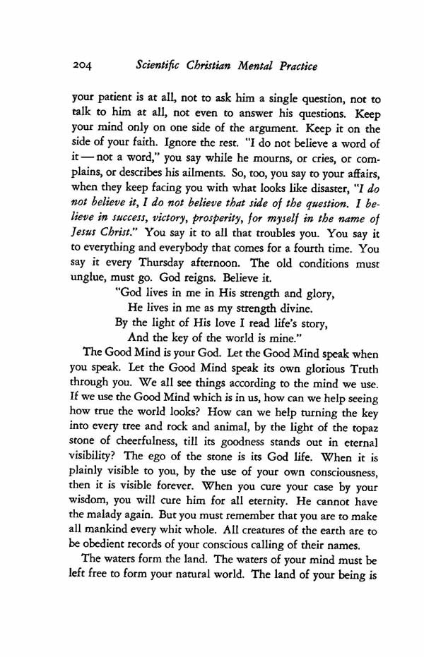 The Good Mind is your God. Let the Good Mind speak when you speak. Let the Good Mind speak its own glorious Truth through you. We all see things according to the mind we use. If we use the Good Mind which is in us, how can we help seeing how true the world looks? How can we help turning the key into every tree and rock and animal, by the light of the topaz stone of cheerfulness, till its goodness stands out in eternal visibility? The ego of the stone is its God life. When it is plainly visible to you, by the use of your own consciousness, then it is visible forever. When you cure your case by your wisdom, you will cure him for all eternity. He cannot have the malady again. But you must remember that you are to make all mankind every whit whole. All creatures of the earth are to be obedient records of your conscious calling of their names.