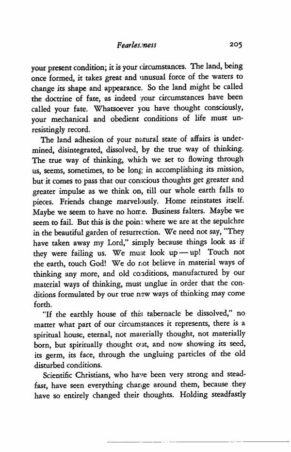 The land adhesion of your natural state of affairs is undermined, disintegrated, dissolved, by the true way of thinking. The true way of thinking, which we set to flowing through us, seems, sometimes, to be long in accomplishing its mission, but it comes to pass that our conscious thoughts get greater and greater impulse as we think on, till our whole earth falls to pieces. Friends change marvelously. Home reinstates itself. Maybe we seem to have no home. Business falters. Maybe we seem to fail. But this is the point where we are at the sepulchre in the beautiful garden of resurrection. We need not say, "They have taken away my Lord," simply because things look as if they were failing us. We must look up up! Touch not the earth, touch God! We do not believe in material ways of thinking any more, and old conditions, manufactured by our material ways of thinking, must unglue in order that the conditions formulated by our true new ways of thinking may come forth.