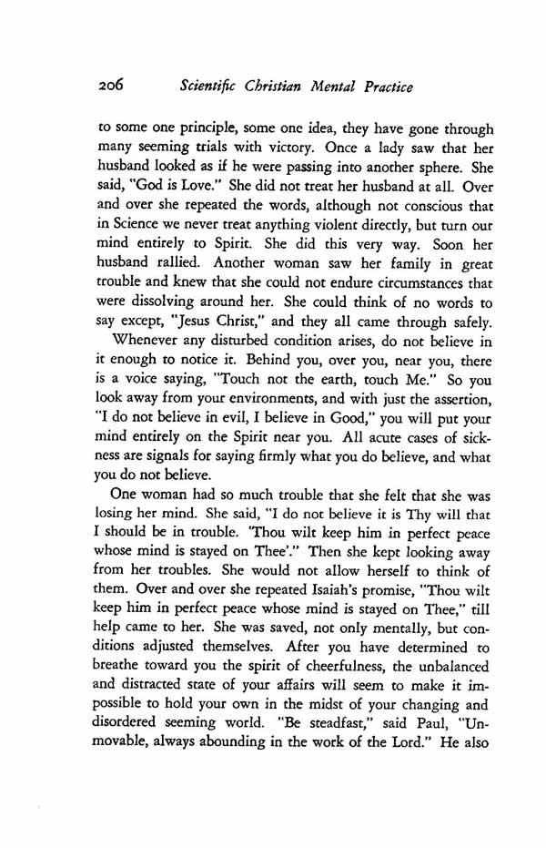 to some one principle, some one idea, they have gone through many seeming trials with victory. Once a lady saw that her husband looked as if he were passing into another sphere. She said, "God is Love." She did not treat her husband at all. Over and over she repeated the words, although not conscious that in Science we never treat anything violent directly, but turn our mind entirely to Spirit. She did this very way. Soon her husband rallied. Another woman saw her family in great trouble and knew that she could not endure circumstances that were dissolving around her. She could think of no words to say except, "Jesus Christ," and they all came through safely.