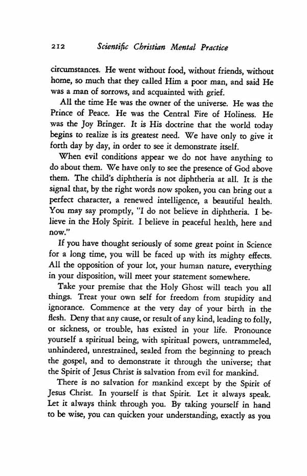 Take your premise that the Holy Ghost will teach you all things. Treat your own self for freedom from stupidity and ignorance. Commence at the very day of your birth in the flesh. Deny that any cause, or result of any kind, leading to folly, or sickness, or trouble, has existed in your life. Pronounce yourself a spiritual being, with spiritual powers, untrammeled, unhindered, unrestrained, sealed from the beginning to preach the gospel, and to demonstrate it through the universe; that the Spirit of Jesus Christ is salvation from evil for mankind.