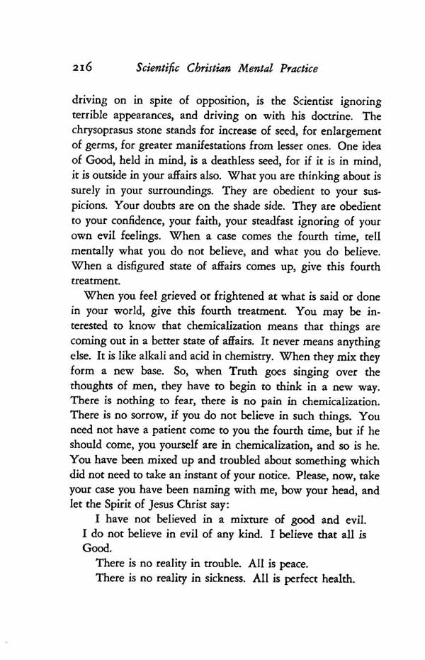 When you feel grieved or frightened at what is said or done in your world, give this fourth treatment. You may be interested to know that chemicalization means that things are coming out in a better state of affairs. It never means anything else. It is like alkali and acid in chemistry. When they mix they form a new base. So, when Truth goes singing over the thoughts of men, they have to begin to think in a new way. There is nothing to fear, there is no pain in chemicalization. There is no sorrow, if you do not believe in such things. You need not have a patient come to you the fourth time, but if he should come, you yourself are in chemicalization, and so is he. You have been mixed up and troubled about something which did not need to take an instant of your notice. Please, now, take your case you have been naming with me, bow your head, and let the Spirit of Jesus Christ say: