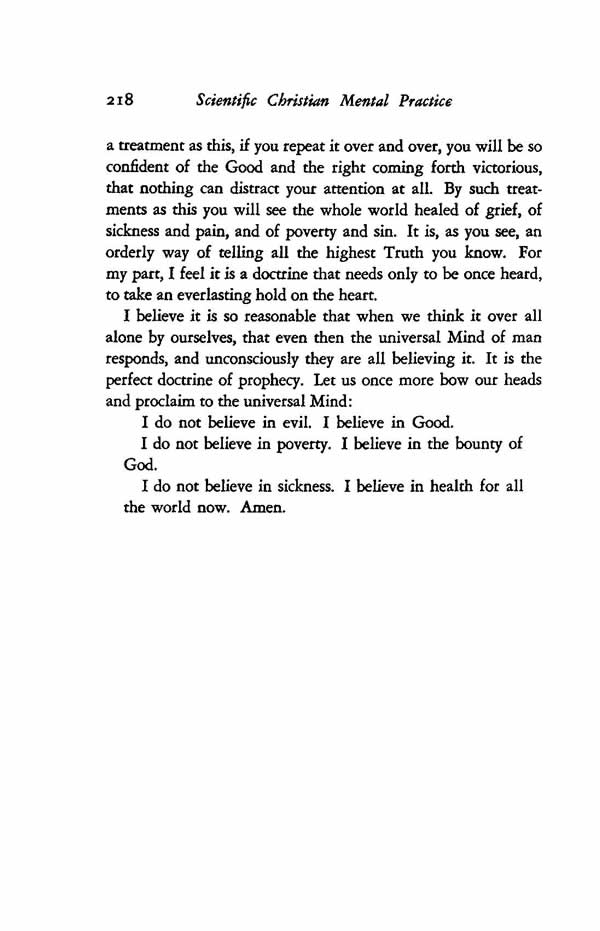 a treatment as this, if you repeat it over and over, you will be so confident of the Good and the right coming forth victorious, that nothing can distract your attention at all. By such treatments as this you will see the whole world healed of grief, of sickness and pain, and of poverty and sin. It is, as you see, an orderly way of telling all the highest Truth you know. For my part, I feel it is a doctrine that needs only to be once heard, to take an everlasting hold on the heart.