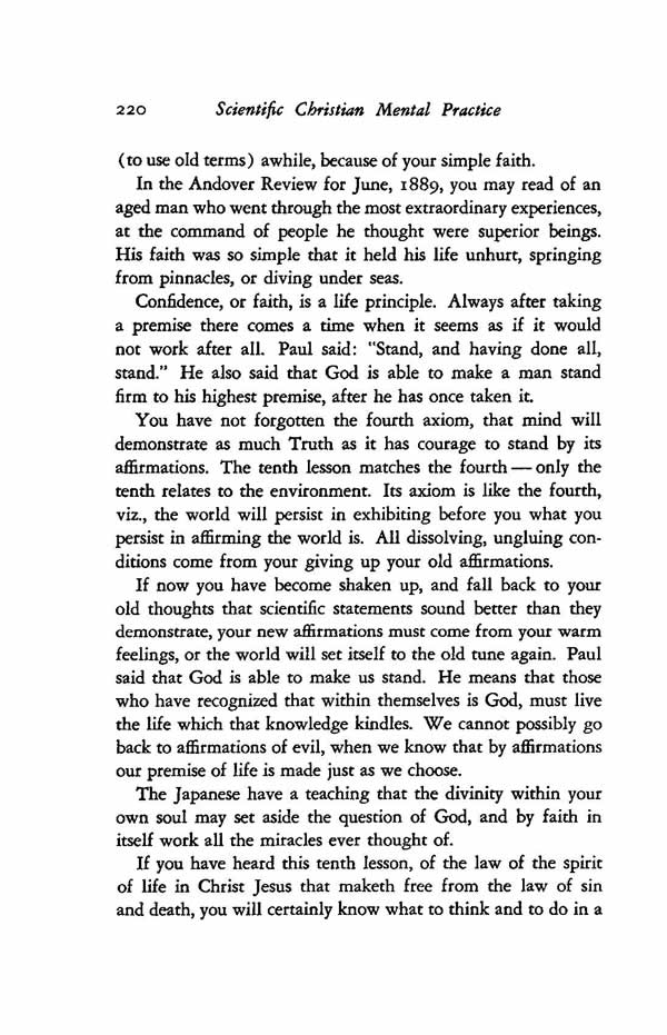 If now you have become shaken up, and fall back to your old thoughts that scientific statements sound better than they demonstrate, your new affirmations must come from your warm feelings, or the world will set itself to the old tune again. Paul said that God is able to make us stand. He means that those who have recognized that within themselves is God, must live the life which that knowledge kindles. We cannot possibly go back to affirmations of evil, when we know that by affirmations our premise of life is made just as we choose.