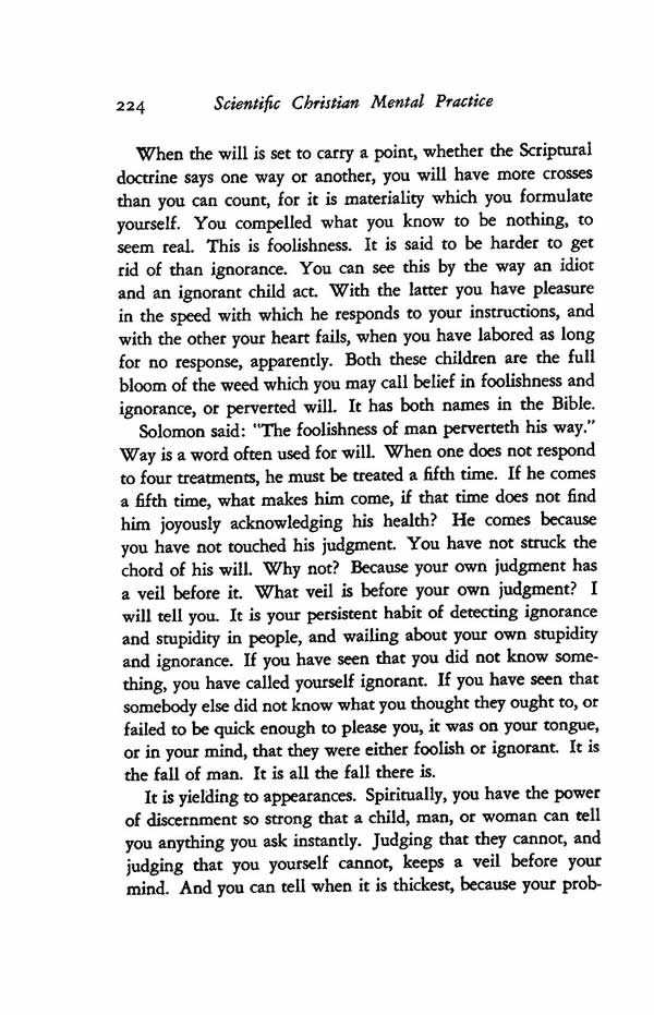 Solomon said: "The foolishness of man perverteth his way." Way is a word often used for will. When one does not respond to four treatments, he must be treated a fifth time. If he comes a fifth time, what makes him come, if that time does not find him joyously acknowledging his health? He comes because you have not touched his judgment. You have not struck the chord of his will. Why not? Because your own judgment has a veil before it. What veil is before your own judgment? I will tell you. It is your persistent habit of detecting ignorance and stupidity in people, and wailing about your own stupidity and ignorance. If you have seen that you did not know something, you have called yourself ignorant. If you have seen that somebody else did not know what you thought they ought to, or failed to be quick enough to please you, it was on your tongue, or in your mind, that they were either foolish or ignorant. It is the fall of man. It is all the fall there is.