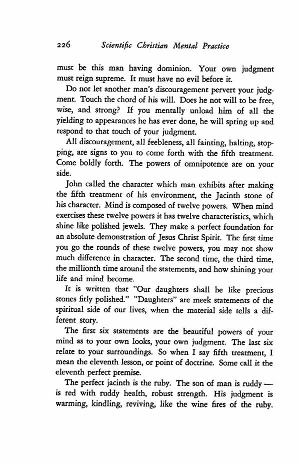 John called the character which man exhibits after making the fifth treatment of his environment, the Jacinth stone of his character. Mind is composed of twelve powers. When mind exercises these twelve powers it has twelve characteristics, which shine like polished jewels. They make a perfect foundation for an absolute demonstration of Jesus Christ Spirit. The first time you go the rounds of these twelve powers, you may not show much difference in character. The second time, the third time, the millionth time around the statements, and how shining your life and mind become.
