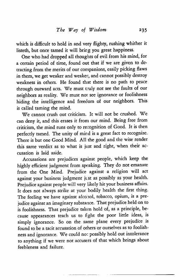 Accusations are prejudices against people, which keep the highly efficient judgment from speaking. They do not emanate from the One Mind. Prejudice against a religion will act against your business judgment just as possibly as your health. Prejudice against people will very likely hit your business affairs. It does not always strike at your bodily health the first thing. The feeling we have against alcohol, tobacco, opium, is a prejudice against an imaginary substance. That prejudice held on to is foolishness. That prejudice taken hold of, as a principle, because appearances teach us to fight the poor little ideas, is simply ignorance. So on the same plane every prejudice is found to be a tacit accusation of others or ourselves as to foolishness and ignorance. We could not possibly hold out intolerance to anything if we were not accusers of that which brings about feebleness and failure.