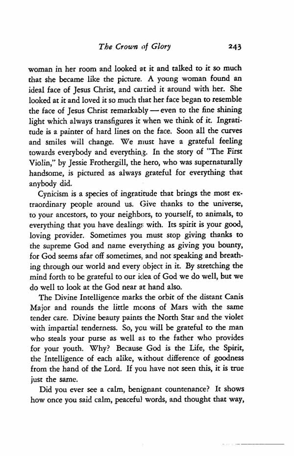 woman in her room and looked at it and talked to it so much that she became like the picture. A young woman found an ideal face of Jesus Christ, and carried it around with her. She looked at it and loved it so much that her face began to resemble the face of Jesus Christ remarkably even to the fine shining light which always transfigures it when we think of it. Ingratitude is a painter of hard lines on the face. Soon all the curves and smiles will change. We must have a grateful feeling towards everybody and everything. In the story of "The First Violin," by Jessie Frothergill, the hero, who was supernaturally handsome, is pictured as always grateful for everything that anybody did.