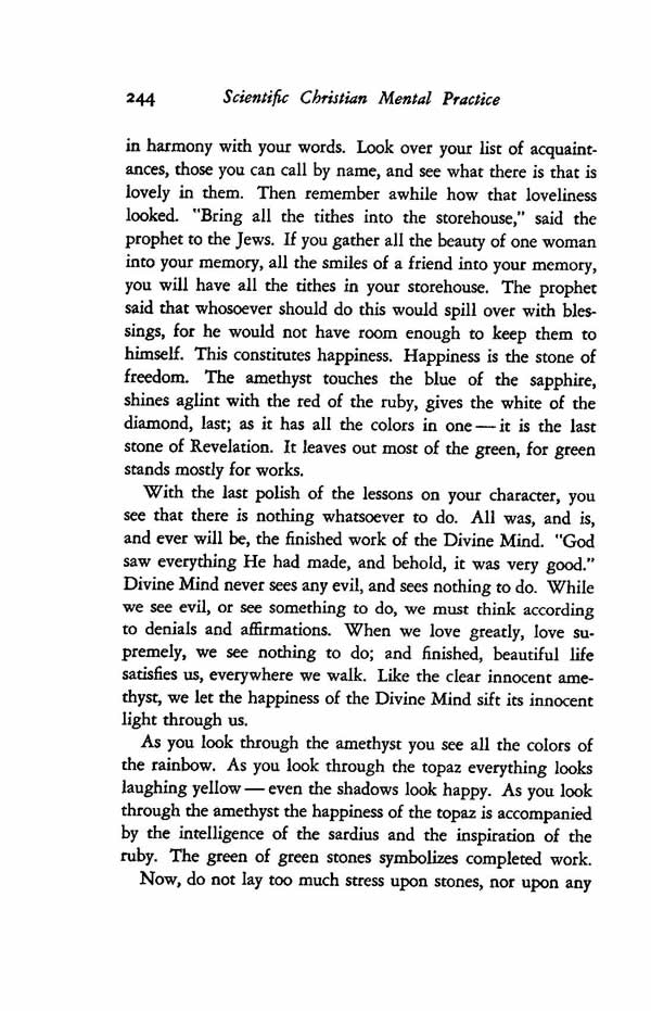 in harmony with your words. Look over your list of acquaintances, those you can call by name, and see what there is that is lovely in them. Then remember awhile how that loveliness looked. "Bring all the tithes into the storehouse," said the prophet to the Jews. If you gather all the beauty of one woman into your memory, all the smiles of a friend into your memory, you will have all the tithes in your storehouse. The prophet said that whosoever should do this would spill over with blessings, for he would not have room enough to keep them to himself. This constitutes happiness. Happiness is the stone of freedom. The amethyst touches the blue of the sapphire, shines aglint with the red of the ruby, gives the white of the diamond, last; as it has all the colors in one it is the last stone of Revelation. It leaves out most of the green, for green stands mostly for works.