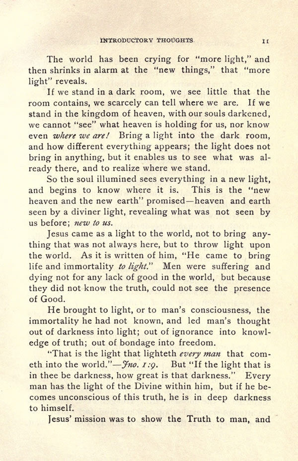 Jesus came as a light to the world, not to bring anything that was not always here, but to throw light upon the world. As it is written of him, He came to bring life and immortality to light." Men were suffering and dying not for any lack of good in the world, but because they did not know the truth, could not see the presence of Good.