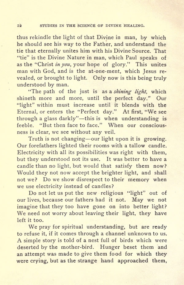 We pray for spiritual understanding, but are ready to refuse it, if it comes through a channel unknown to us. A simple story is told of a nest full of birds which were deserted by the mother-bird. Hunger beset them and an attempt was made to give them food for which they were crying, but as the strange hand approached them,