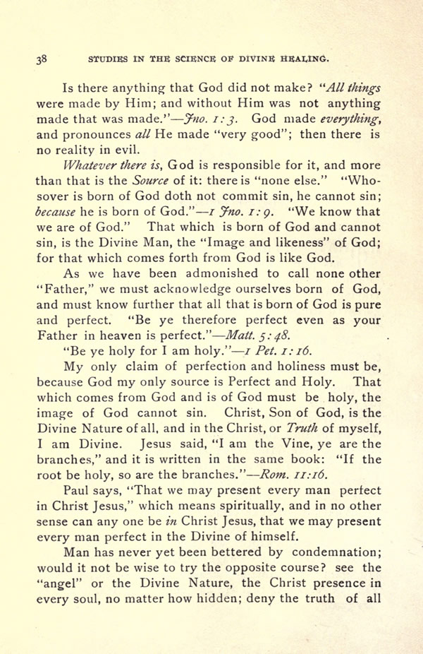 My only claim of perfection and holiness must be, because God my only source is Perfect and Holy. That which comes from God and is of God must be holy, the image of God cannot sin. Christ, Son of God, is the Divine Nature of all, and in the Christ, or Truth of myself, I am Divine. Jesus said, "I am the Vine, ye are the branches," and it is written in the same book: "If the root be holy, so are the branches." -- Rom 11:16