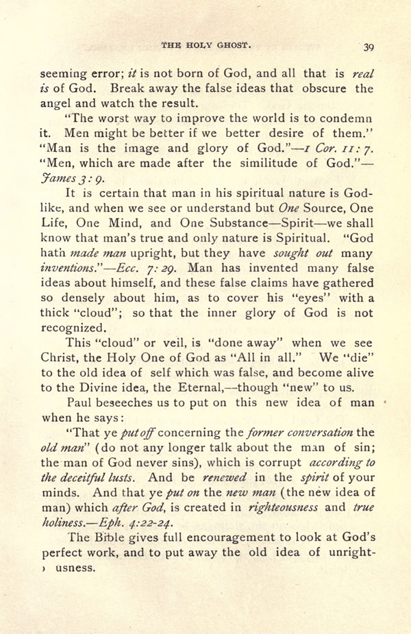 It is certain that man in his spiritual nature is Godlike, and when we see or understand but One Source, One Life, One Mind, and One Substance -- Spirit -- we shall know that man's true and only nature is Spiritual. "God hath made man upright, but they have sought out many inventions.'' -- Ecc. 7:29. Man has invented many false ideas about himself, and these false claims have gathered so densely about him, as to cover his "eyes" with a thick "cloud"; so that the inner glory of God is not recognized.