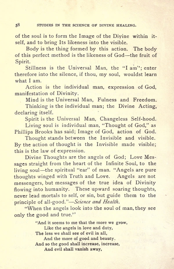 Divine Thoughts are the angels of God; Love Messages straight from the heart of the Infinite Soul, to the living soul -- the spiritual "ear" of man. "Angels are pure thoughts winged with Truth and Love. Angels are not messengers, but messages of the true idea of Divinity flowing into humanity. These upward soaring thoughts, never lead mortals to self, or sin, but guide them to the principle of all-good." -- Science and Health.